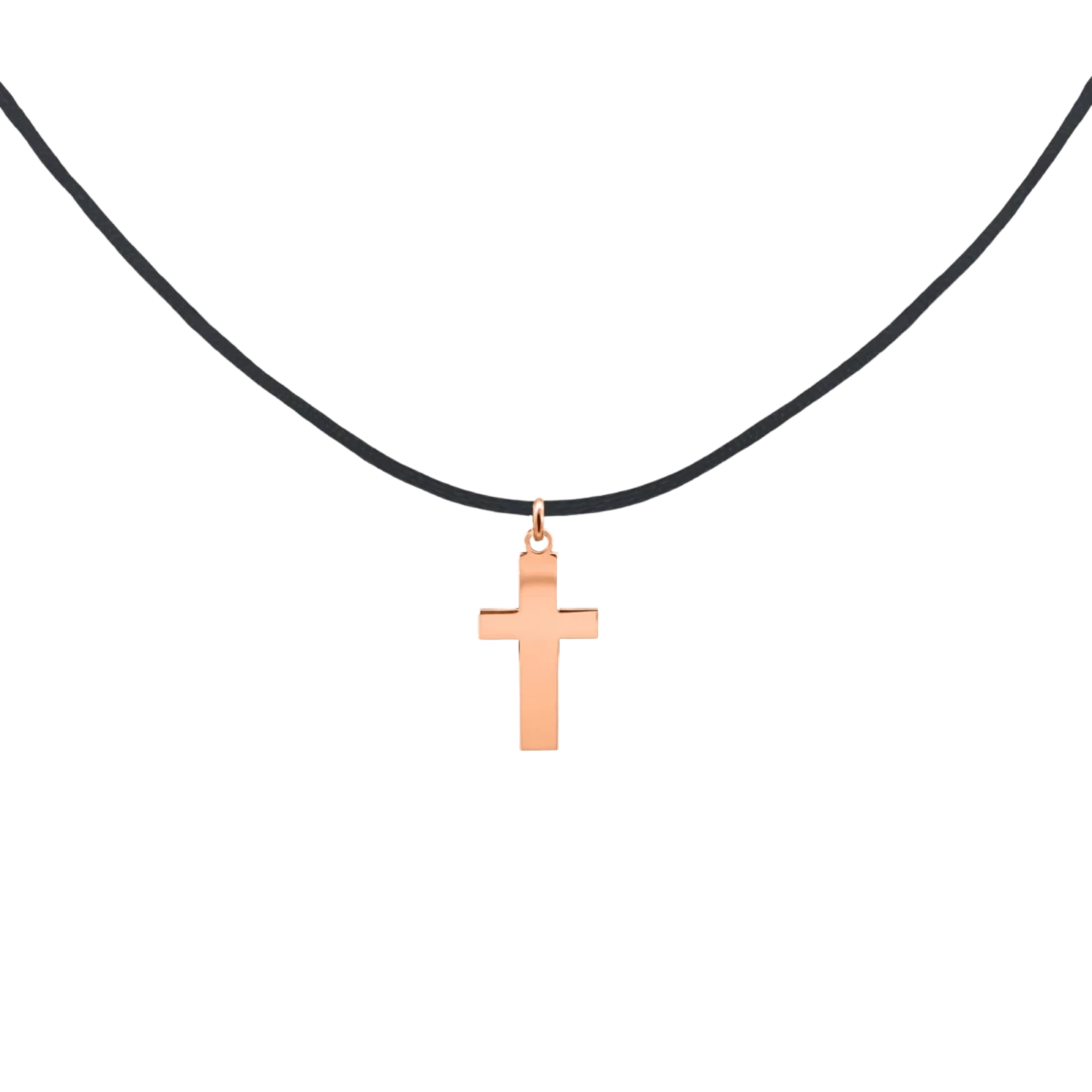 Vastag fonalra fűzött, kereszt formájú medál 14 karátos vörösarany zárral. Férfi kollekciónk nagy népszerűségnek örvendő darabja. A medál mérete: 12x20 mm.