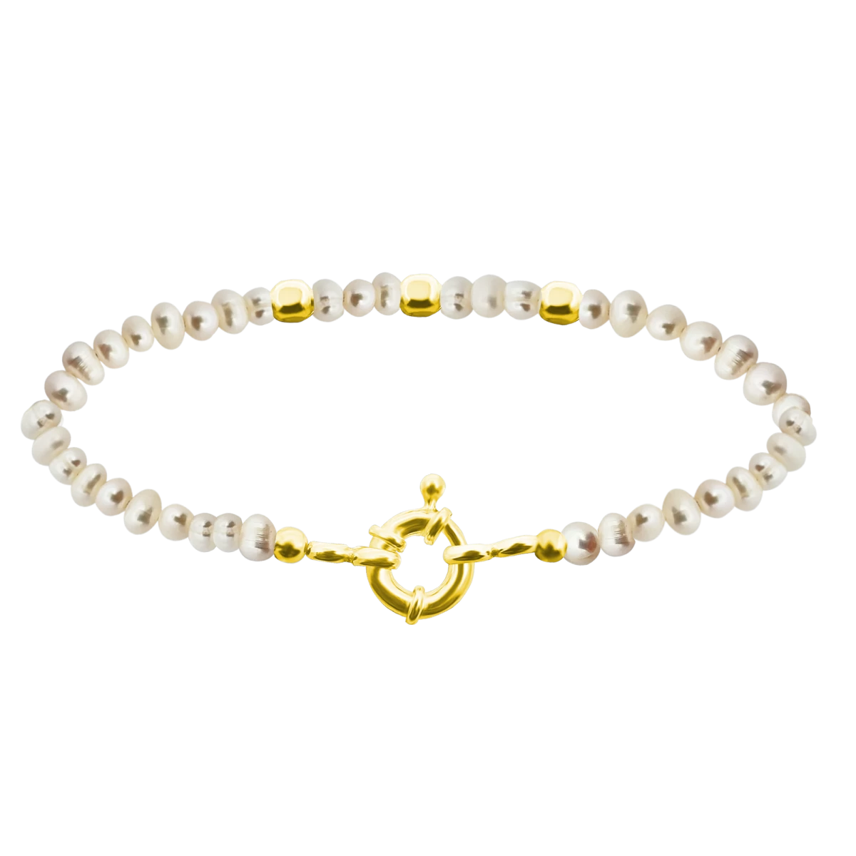 A kifinomultság és a modern design találkozása ebben a karkötőben, ahol a gyöngyök sorát három darab 18 karátos arannyal bevont ezüst, lekerekített kocka formájú kiegészítő töri meg, míg a feltűnő zár biztosítja a látványos megjelenést.
