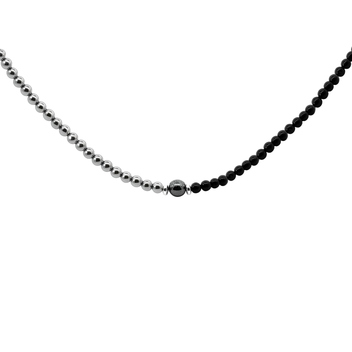 Emeld magasabb szintre a megjelenésed ezzel a férfiaknak tervezett nyaklánccal, amelyet elegáns ezüst színű hematit és mélyfekete ónix ásványok tesznek igazán karakteressé. A modern design és a természetes ásványok kombinációja tökéletesen illik a stílusos, magabiztos férfiakhoz – legyen szó hétköznapi viseletről vagy különleges alkalmakról. A hematit a hagyomány szerint a földelés és a belső egyensúly köve, amely segít a fókuszálásban, növeli a vitalitást és erősíti az önbizalmat. A fekete ónix a védelem és a kitartás szimbóluma, amely támogatja a belső stabilitást és segíthet a negatív energiák kizárásában.