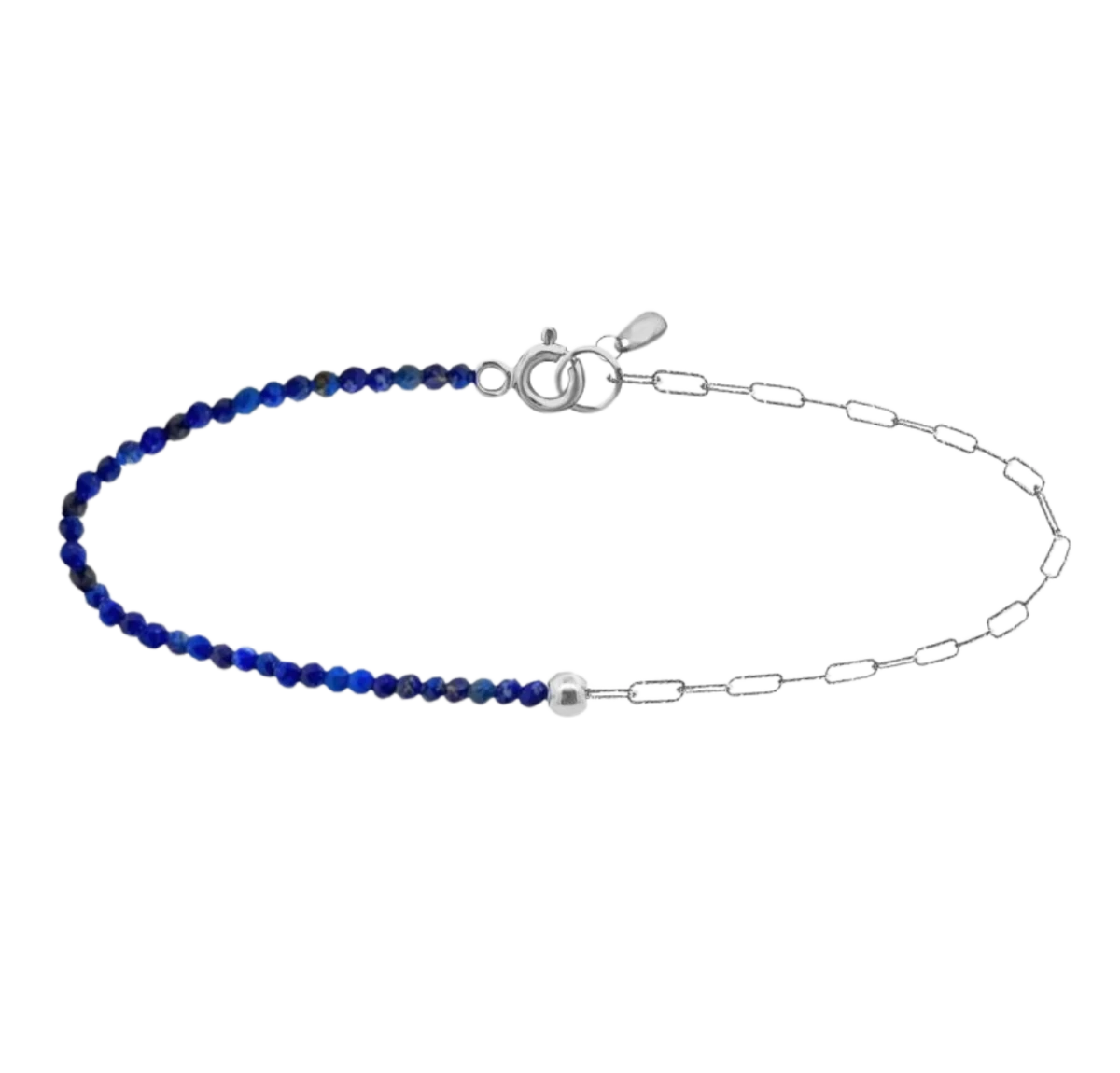 Ásvány és nemesfém találkozása egy ékszerben. Az ovális láncszemek felülete vésett, a hagyományos láncoktól eltérő kialakítású. A láncszemek mérete: 3 x 7,5 mm. A lápisz lazuli jelentése: kék kő. Régen az uralkodók kövének tartották. Stresszoldó, csökkenti a depressziót, immunizál. Jótékony hatásssal van a pajzsmirigyre és a torokra. Viselőjének önbizalmat ad, fejleszti a kommunikációt. Erős spirituális kő, meditáció közben hasznos társ.