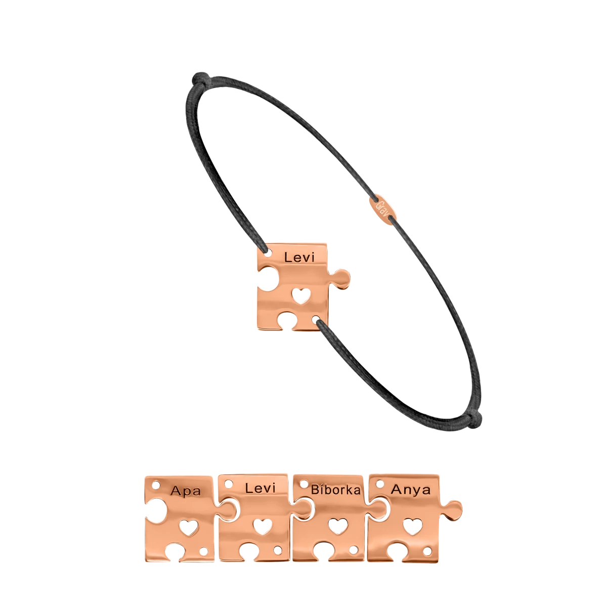 Stílust és érzelmet egyesít ez a különlegesen tervezett puzzle formájú karkötő, ahol mind a négy medál gravírozott üzenete a viselő és szerettei közötti kapcsolatok mély, személyes jelentőségét tükrözik, épp úgy szerelmespárok, barátok és családok számára. A medálokra gravírozandó neveket, a karkötők méretét és a választott fonalszínt a Megjegyzés mezőben jelezd nekünk!